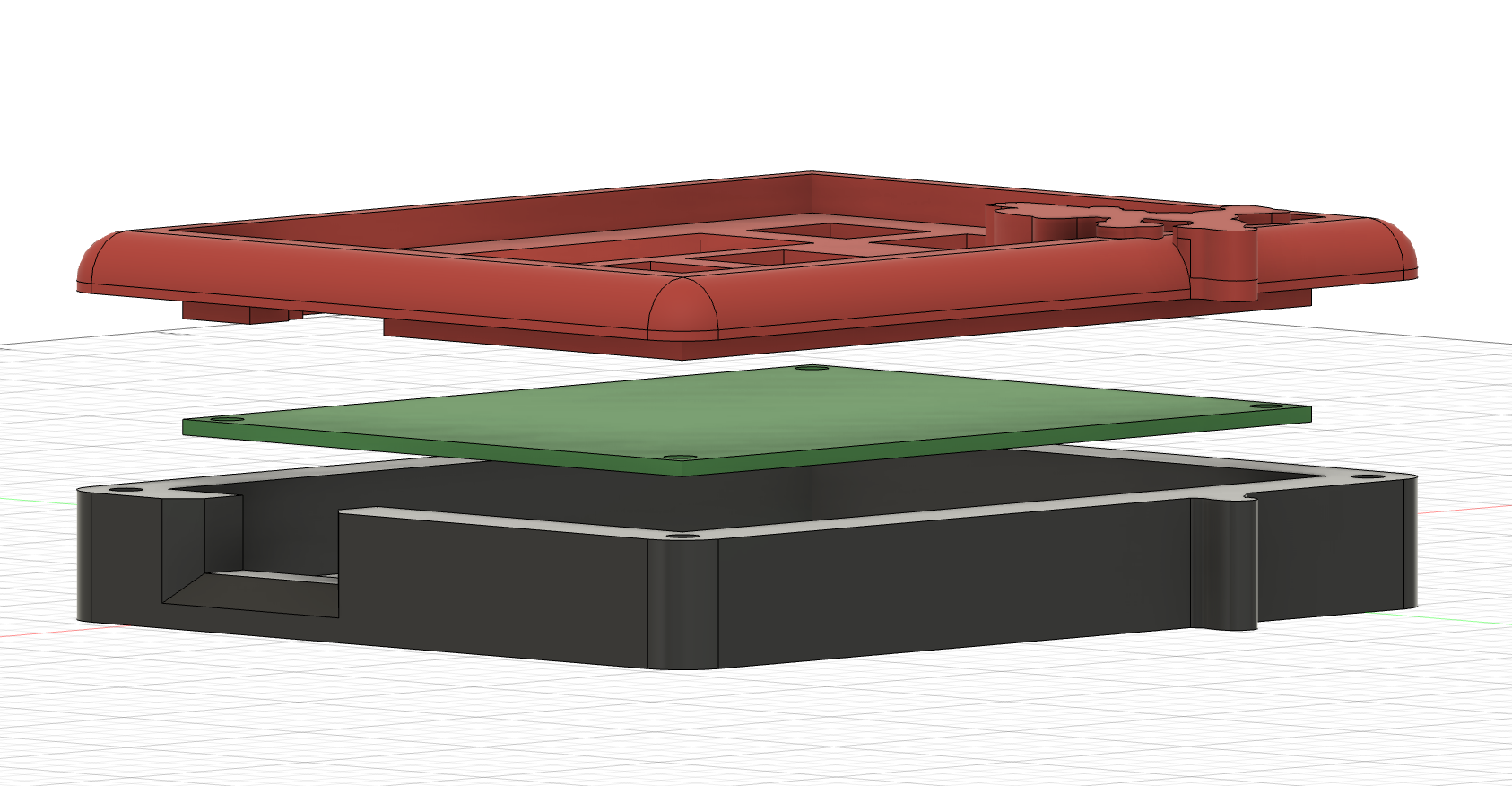 The case was made in Fusion360, using DXF files of the PCB to ensure accurate measurements for all parts. The case is secured together with 4 M3 screws, and the PCB is secured to the lid using 4 M3 screws.
