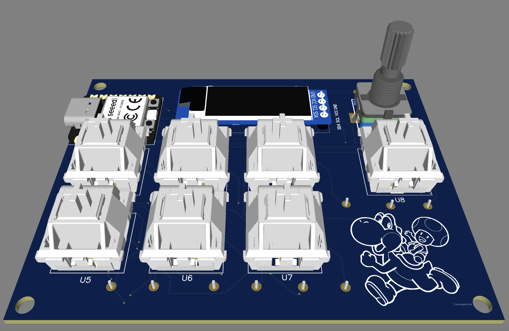 My 1-Up Hackpad has 7 keys: 2 rows of 3, plus one extra key that will look like Mario hitting a question mark block. It also has a rotary encoder and a 128x32 OLED screen.
