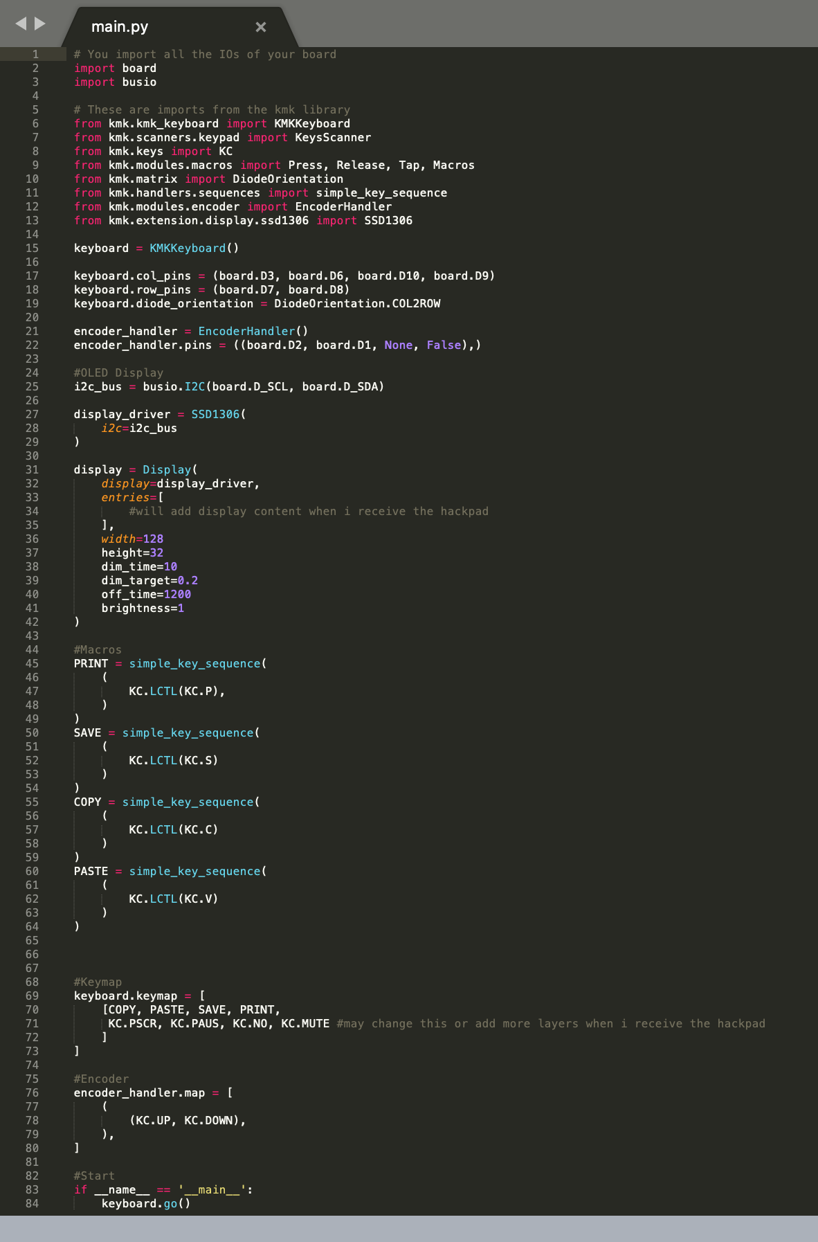 I used KMK for my firmware. I mapped the keys to different Macros that I may change or add to later. I mapped the rotary encoder and encoder button to volume up, volume down, and mute. The screen is mapped and configured but I have not added images to it yet. I also need to decide when I want the neopixels to come on and turn off under the keys.